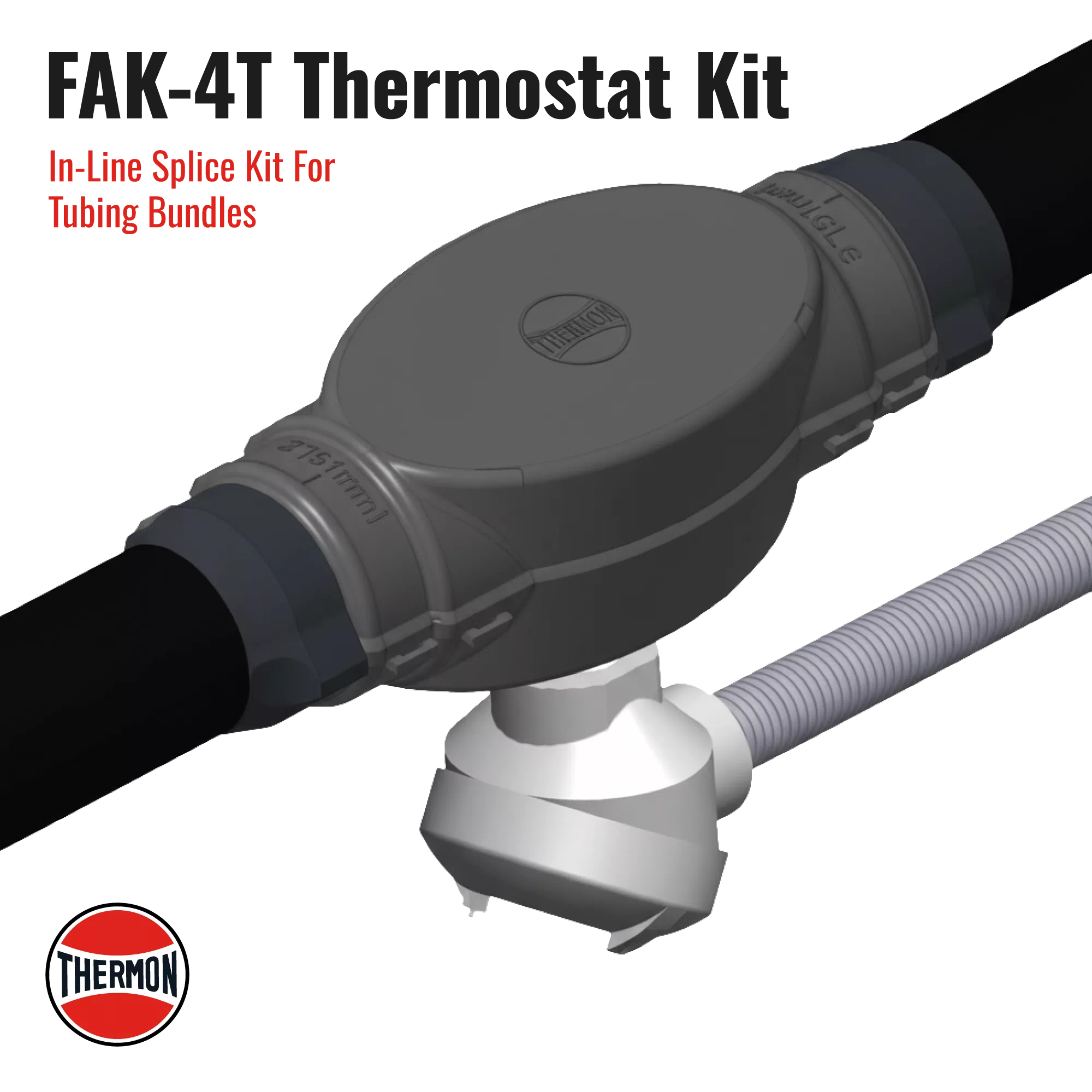 The FAK-4T Thermostat Kit is a control accessory specifically designed to create a weatherproof and insulated seal where a mechanical thermostat sensing bulb is to be installed onto an electrically heated TubeTrace bundle. This installation point is necessary when a thermostat is used for simple on/off temperature control or as a high-limit cutoff.