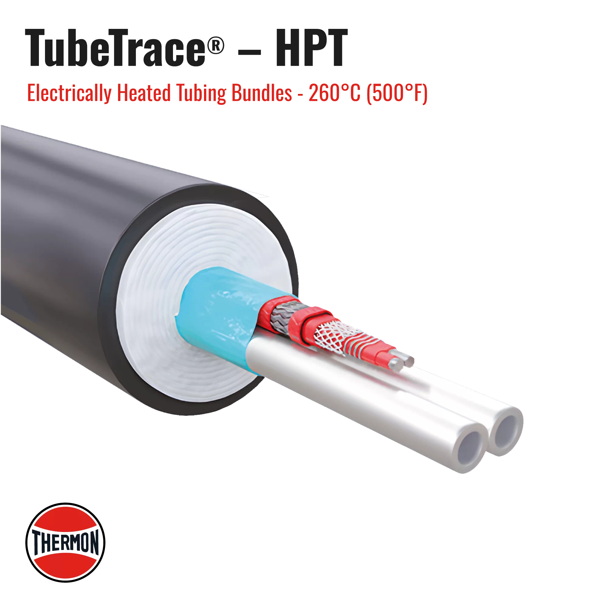 This is an electrically heated and insulated tubing bundle that uses HPT power-limiting heat tracing and is considered the industry standard for high-temperature emissions and process analyzer applications due to its durability. It is designed to provide freeze protection or temperature maintenance up to 204°C (400°F) while having the capability to withstand high exposure temperatures up to 260°C (500°F) when the power is off. The HPT heating cable features a composite construction that provides durability, and its power-limiting nature means it automatically reduces power output as the temperature increases, lowering the risk of overheating.